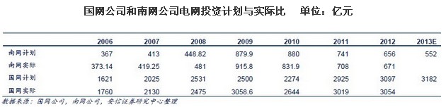 2008 年國家推動(dòng)電網(wǎng)建設提出的是城網(wǎng)改造和農網(wǎng)完善,目的是為了拉動(dòng)內需。與此相呼應,發(fā)改委安排了40 億作為城農網(wǎng)建設和改造資本金,加上企業(yè)貸款,總規模達200 億元。南方電網(wǎng)公司2008 年11 月12 日公布2009-2010 年增加電網(wǎng)投資600 億元;2008 年11 月14 日,國家電網(wǎng)公司舉行擴大內需項目簽字儀式暨新聞發(fā)布會(huì ),國家電網(wǎng)年內新增的“拉動(dòng)內需項目”總投資規模為120 億元,在會(huì )上還公布今后2-3 年內投資超萬(wàn)億元的計劃。南網(wǎng)公司2009-2010 年投資比2008 年計劃增加投資850 億元;2009-2011 年國網(wǎng)公司電網(wǎng)投資8722 億元,只是國網(wǎng)的特高壓計劃沒(méi)有完成實(shí)現導致投資計劃沒(méi)有全部完成;應該說(shuō)兩大電網(wǎng)公司都基本兌現了自己的承諾。