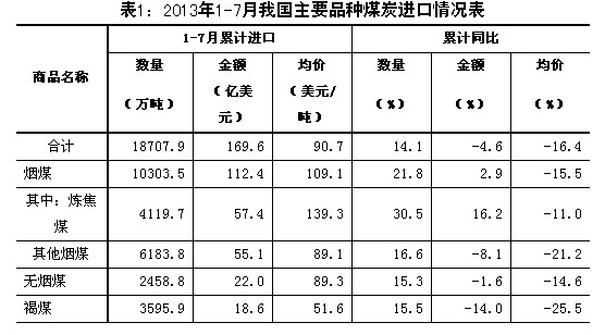 據海關(guān)信息網(wǎng)統計,今年1-7月,我國進(jìn)口煤1.9億噸,增加14.1%;價(jià)值169.6億美元,下降4.6%;進(jìn)口平均價(jià)格為每噸90.7美元,下跌16.4%。