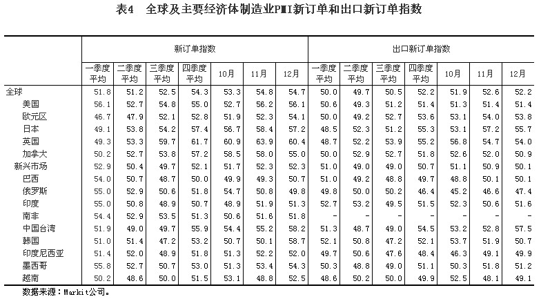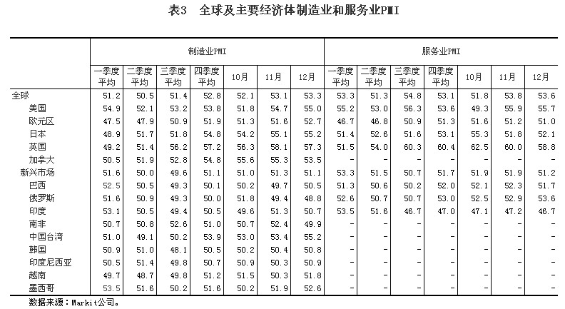 (八)景氣指標總體向好。據OECD統計,12月份,以長(cháng)期趨勢為100,OECD國家整體先行指數達100.9,連續12個(gè)月上升,其中,美國、歐元區和日本分別達101.0、101.1和101.4,均呈上升趨勢,表明今后半年左右時(shí)間內發(fā)達國家經(jīng)濟前景看好。第四季度,全球及主要經(jīng)濟體制造業(yè)PMI及其中的新訂單指數和出口新訂單指數均有所回升,新興市場(chǎng)制造業(yè)這三個(gè)指標均重回景氣區間;全球服務(wù)業(yè)PMI受美國服務(wù)業(yè)PMI大幅下降的拖累比第三季度有所回落,但仍處于景氣區間且顯著(zhù)高于上半年。12月份,全球制造業(yè)PMI升至53.3的近32個(gè)月最高水平,已連續第13個(gè)月高于50的臨界點(diǎn)。其中,新訂單指數為54.7,僅比11月份的近33個(gè)月新高略低0.1個(gè)點(diǎn)。