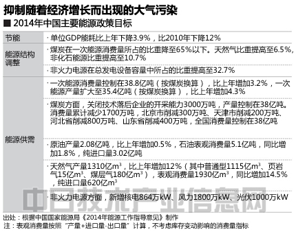 2013年,中國的煤炭火力發(fā)電比重降至65.7%,與2015年降至65%的目標接近。不過(guò),因為煤炭消費量比上年增加2.5%,所以未能控制住日益嚴重的“PM2.5”污染。因此,2014年煤炭消費量將控制在38億噸。計劃使煤炭比重降至65%以下,同時(shí)使天然氣的比重增至6.5%。