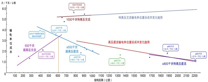 而超高壓輸電工程是按單價(jià)2元/(公里*千瓦)計算的,這是當前輸電設計規劃進(jìn)行方案比較的一般取值。于是得到以下的結論: