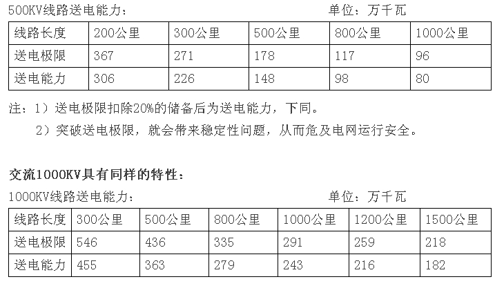 上述有效的數據表明,雖然1000KV電壓與500KV電壓的送電能力提高了2~3倍,卻同樣擺脫不了交流輸電穩定性基本規律的制約:當送電距離為300公里時(shí)送電能力455萬(wàn)千瓦;當送電距離達到1500公里時(shí),送電能力降到182萬(wàn)千瓦。如果要遠距輸送功率,必需每隔約300公里建變電站,取得超高壓電網(wǎng)的足夠大的電源支撐,造成安全隱患和工程費上升。