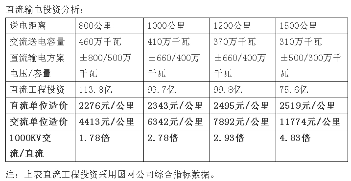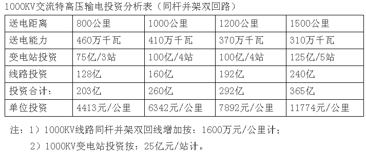 從上表可以清楚看出,1000KV線(xiàn)路送電800公里,送電能力為460萬(wàn)千瓦,工程投資203億元,折合每公里輸電單位造價(jià)4413元/公里;當送電距離增加到1500公里時(shí),送電能力下降到310萬(wàn)千瓦,而輸電投資增加到365億元,折合到每公里輸電單位造價(jià)11774元/公里,增加了2.67倍。