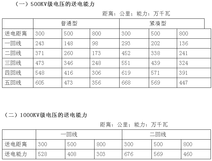 在進(jìn)行建設方案比較時(shí),上述兩張表相關(guān)數據表明,500KV電壓級的送電能力要達到460-680萬(wàn)千瓦,送電回路數大約需要5回(緊湊型),也就是說(shuō),1000KV級電壓的送電能力大約為500KV級電壓送電能力的2.5倍。