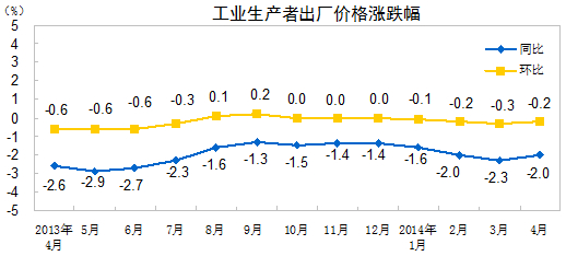 2014年4月份,全國工業(yè)生產(chǎn)者出廠(chǎng)價(jià)格同比下降2.0%,環(huán)比下降0.2%。工業(yè)生產(chǎn)者購進(jìn)價(jià)格同比下降2.3%,環(huán)比下降0.4%。1-4月平均,工業(yè)生產(chǎn)者出廠(chǎng)價(jià)格同比下降2.0%,工業(yè)生產(chǎn)者購進(jìn)價(jià)格同比下降2.2%。