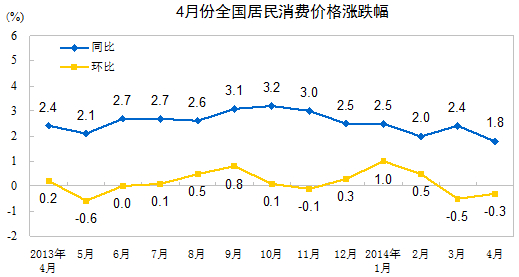 2014年4月份,全國居民消費價(jià)格總水平同比上漲1.8%。其中,城市上漲1.9%,農村上漲1.6%;食品價(jià)格上漲2.3%,非食品價(jià)格上漲1.6%;消費品價(jià)格上漲1.4%,服務(wù)價(jià)格上漲2.7%。1-4月平均,全國居民消費價(jià)格總水平比去年同期上漲2.2%。