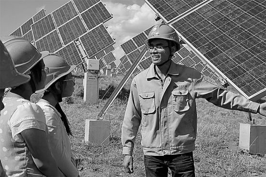 “這些藍色的面板就是太陽(yáng)能組件。”該電站的光伏主管翟化欣指著(zhù)一塊塊的多晶硅太陽(yáng)能電池說(shuō),這些面板是由一個(gè)個(gè)的半導體“硅”組成,他們就像一個(gè)個(gè)的“小吸收員”,盡情地吸收著(zhù)金色的陽(yáng)光,繼而源源不斷地輸出電能。