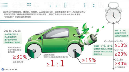 在此基礎上,方案提出,政府機關(guān)及公共機構購買(mǎi)機動(dòng)車(chē)輛應當優(yōu)先選用新能源汽車(chē)。同時(shí)明確:2014年至2016年,中央國家機關(guān)以及納入新能源汽車(chē)推廣應用城市的政府機關(guān)和公共機構,購買(mǎi)的新能源汽車(chē)占當年配備更新總量的比例不低于30%,以后逐年提高。
