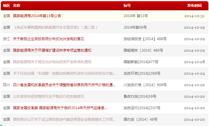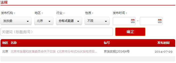 1. 分類(lèi)查詢(xún):可按照發(fā)布機構、地區、行業(yè)、性質(zhì)和發(fā)布時(shí)間進(jìn)行分類(lèi)查找和篩選,可以單一條件也可以復合條件分類(lèi),比如可以選擇“發(fā)改委”“北京”“分布式能源”三個(gè)選項,就可以直接查詢(xún)到“北京市發(fā)展和改革委員會(huì )關(guān)于印發(fā)《北京市分布式光伏發(fā)電項目管理暫行辦法》的通知”該條法規政策。