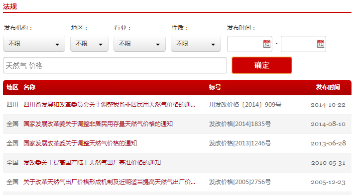 2. 快速搜索:可在搜索欄直接輸入關(guān)鍵詞、標題或標號等進(jìn)行搜索,便于快速查詢(xún)到目標內容。比如輸入“天然氣 價(jià)格”兩個(gè)關(guān)鍵詞,就可以得到“國家發(fā)展改革委關(guān)于調整天然氣價(jià)格的通知”等一系列相關(guān)結果。