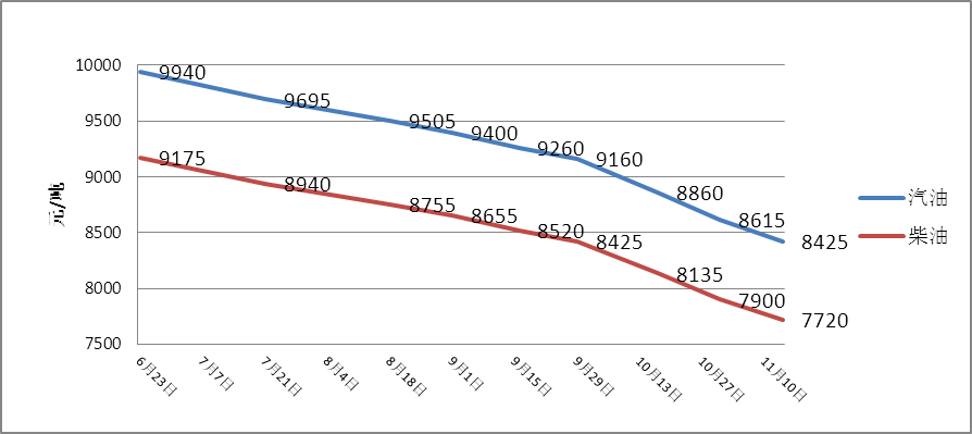 國內成品油價(jià)格因國際油價(jià)也不斷下跌,北京90號汽油的價(jià)格從6月23日的9940元/噸,連續八次下跌到11月14日的8425元/噸,下跌了1515元/噸,跌幅達15.24%(見(jiàn)圖2)。