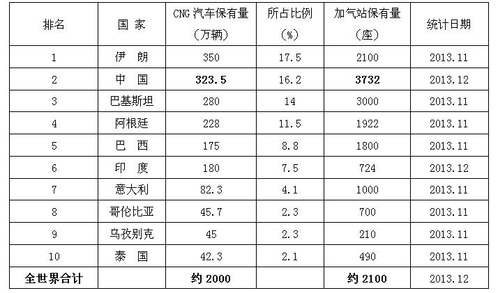 (表1)各國CNG汽車(chē)和加氣站2013年數據