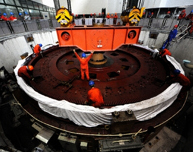 浙能北海水電公司在對2號機組檢修時(shí),吊裝發(fā)電機組轉子。該發(fā)電機組轉子重達450噸,直徑10米。