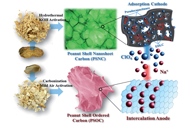 那么,為什么用花生殼作母體呢?Mitlin說(shuō),他們容易得到、價(jià)格低廉且商業(yè)用途有限,他們最終的歸宿多是垃圾填埋場(chǎng)。然而,花生殼并不是隨意被選擇的,是課題組認為花生殼內外的重要結構特征分別是理想陽(yáng)極和陰極材料所需要具備的?;ㄉ鷼炔恐饕筛叨冉宦?lián)的木質(zhì)素聚合物構成,使其適于組裝擴張石墨烯層,以嵌入鈉離子作為高效陽(yáng)極。陰極是一種具有高表面積的石墨烯狀材料,由富含纖維素的異質(zhì)花生外殼合成。