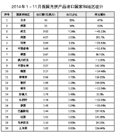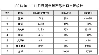 在日前由中國光伏行業(yè)協(xié)會(huì )主辦的“光伏行業(yè)發(fā)展與投資分析——2014年回顧與2015年展望”研討會(huì )上,中國機電產(chǎn)品進(jìn)出口商會(huì )副秘書(shū)長(cháng)孫廣斌分享了最新的光伏產(chǎn)品進(jìn)出口統計數據,并對光伏貿易糾紛對我國光伏產(chǎn)業(yè)帶來(lái)的影響進(jìn)行了分析。面對森嚴的貿易壁壘,在2013年光伏產(chǎn)品出口額同比下降近18%的基礎上,2014年迎來(lái)觸底反彈,1~11月出口額同比增長(cháng)近16%,達到131億美元。其中,日本市場(chǎng)同比增長(cháng)67%,達到45億美元,占到出口總額的33%;美國市場(chǎng)同比增長(cháng)35%,達到21億美元,占到出口總額的16%;歐洲市場(chǎng)萎縮30%,不足25億美元,份額降至18.75%。