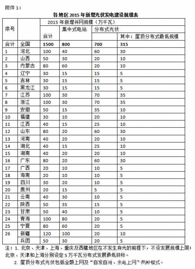 一,為穩定擴大光伏發(fā)電應用市場(chǎng),2015年全國新增光伏發(fā)電并網(wǎng)容量目標為1500萬(wàn)千萬(wàn)(15GW)左右,其中集中式光伏電站800萬(wàn)千萬(wàn),分布式光伏700萬(wàn)千萬(wàn)。綜合考慮屋頂分布式光伏發(fā)電項目的特點(diǎn)和各地區的建設條件,對各地區提出最低任務(wù)指標,但不設年度規模上限。