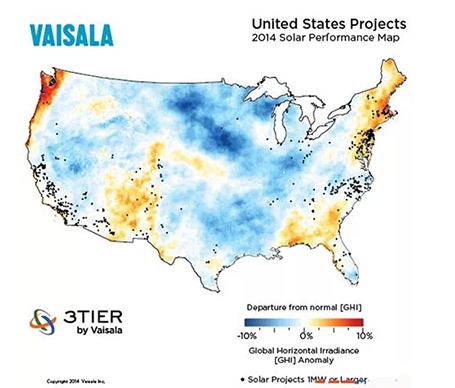 首先是糟糕的天氣。下圖可見(jiàn),加州南部和內華達州2014年的輻照水平與過(guò)去15年的平均數據相比產(chǎn)生了很大的偏離。Ivanpah項目位于加州南部靠近內華達的邊界位置,正好是在地圖中的藍色部分。