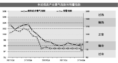 2014年中經(jīng)煤炭產(chǎn)業(yè)景氣指數(由經(jīng)濟日報社中經(jīng)產(chǎn)業(yè)景氣指數研究中心和國家統計局中國經(jīng)濟景氣監測中心共同編制)較2013年微跌0.2點(diǎn),景氣值為95.9,繼續維持低位運行,預警指數連續8個(gè)季度走平(63)。