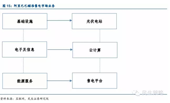 能源數據分析→云平臺→布局收購光伏電站→售電市場(chǎng)。阿里云計算對售電市場(chǎng)的布局起步于與中石油合作進(jìn)行能源數據的采集處理,從而使得企業(yè)擁有了能源大數據分析的能力。第二步,阿里牽手陽(yáng)光電源推出輸配側云平臺“iSolarCloud”,將數據分析能力與云計算融合,實(shí)現發(fā)電端數字化云管理。之后,旗下基金攜手聯(lián)合光伏布局收購光伏電站,瞄準售電市場(chǎng)的野心已顯現。若光伏發(fā)電站大量接入云平臺后,阿里云計算便完成了售電平臺雛形的建立。目前,阿里巴巴售電平臺布局僅差三步便可完善,一為大量光伏電站接入云平臺,二為云平臺能源數據采集分析由輸配端延伸至用戶(hù)端,三為等待電力交易市場(chǎng)化試點(diǎn)成熟。