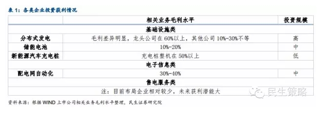 第二,轉型企業(yè)搶占先機,原有能源設施建設能力與新技術(shù)相結合,最有可能現身新增服務(wù)領(lǐng)域——售電運營(yíng)商。能源互聯(lián)網(wǎng)企業(yè)以可再生能源的大量接入、分布式微電網(wǎng)建設、新能源汽車(chē)充電、互聯(lián)網(wǎng)技術(shù)為四大要點(diǎn),此四類(lèi)均為新興領(lǐng)域,傳統企業(yè)誰(shuí)能先轉型,誰(shuí)就能搶占先機,分享能源互聯(lián)網(wǎng)這塊大蛋糕。除此之外,售電服務(wù)是能源互聯(lián)網(wǎng)一塊最大增量,目前鮮少企業(yè)布局。想做服務(wù),不僅要有能源(能源設施建設),還要有網(wǎng)(大數據分析處理能力),因此已經(jīng)具有設施建設能力的能源企業(yè)轉型布局能源服務(wù)之后,最有望現身售電平臺領(lǐng)域,成為能源互聯(lián)網(wǎng)最大贏(yíng)家。