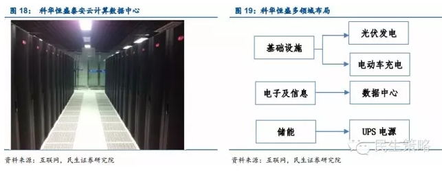 細分產(chǎn)業(yè)專(zhuān)業(yè)化龍頭→產(chǎn)業(yè)鏈跨領(lǐng)域多維布局:電力行業(yè)細分龍頭企業(yè)可憑借其在單一領(lǐng)域專(zhuān)業(yè)化生產(chǎn)所帶來(lái)的資金及技術(shù)實(shí)力,通過(guò)外延式擴張及內生式增長(cháng)結合方式覆蓋產(chǎn)業(yè)鏈多個(gè)領(lǐng)域,例如UPS高端電源企業(yè)科華恒盛轉型配電網(wǎng)整體解決方案提供商,多維布局數據分析處理、新能源發(fā)電、電動(dòng)汽車(chē)充電多領(lǐng)域。公司在數據分析領(lǐng)域推出云動(dòng)力綠色數據中心解決方案,并完成了與北京科華眾生云計算科技有限公司、中經(jīng)云數據存儲科技有限公司的合作。在新能源發(fā)電領(lǐng)域,公司開(kāi)發(fā)的光伏新能源產(chǎn)品方案目前已成功應用于寧夏分布式地面電站、山東泰安分布式光伏并網(wǎng)發(fā)電等十多個(gè)國內外重點(diǎn)項目,電動(dòng)汽車(chē)充電系統也已進(jìn)入市場(chǎng)應用。