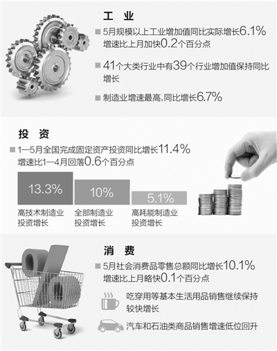 國家統計局11日公布的宏觀(guān)數據顯示,5月份工業(yè)生產(chǎn)增長(cháng)繼續加快,投資增速小幅回升,社會(huì )消費品零售總額繼續保持平穩增長(cháng),特別是新興業(yè)態(tài)繼續快速發(fā)展,國民經(jīng)濟運行仍處于合理區間。