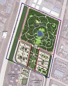 公園南側規劃林陰步道,土壤修復后在公園中心規劃景觀(guān)水面,水面北側草坪上設置雕塑群。其他區域規劃為生態(tài)林地,打造更舒適、更宜居、更好的城市環(huán)境。