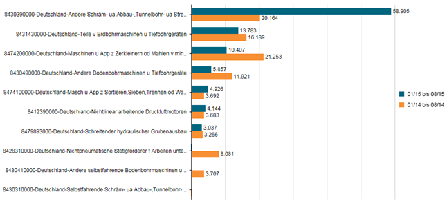 中國是采礦設備制造商最重要的市場(chǎng)之一。德國是中國礦業(yè)的第二大供應商。中國從德國進(jìn)口的份額為12%,僅次于美國的34%。挪威以11%的份額位居第三(根據2014年數據所得)。從2015年一月到八月間德國向中國出口采礦設備總額提高了8.4%,達到1.01億歐元。
