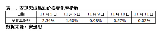 ICIS安迅思2015年11月12日訊——本輪調價(jià)周期內,國際原油價(jià)格反彈帶動(dòng)成品油價(jià)格變化率以正值開(kāi)盤(pán);而隨著(zhù)俄羅斯原油產(chǎn)量創(chuàng )記錄,美國原油庫存持續增長(cháng)等因素出現,國際原油轉而下滑,成品油價(jià)格變化率逐漸縮窄并轉為負數。安迅思監測數據顯示,11月11日,安迅思成品油價(jià)格變化率指數為-0.02%,國內汽柴油零售下調幅度約5元/噸。