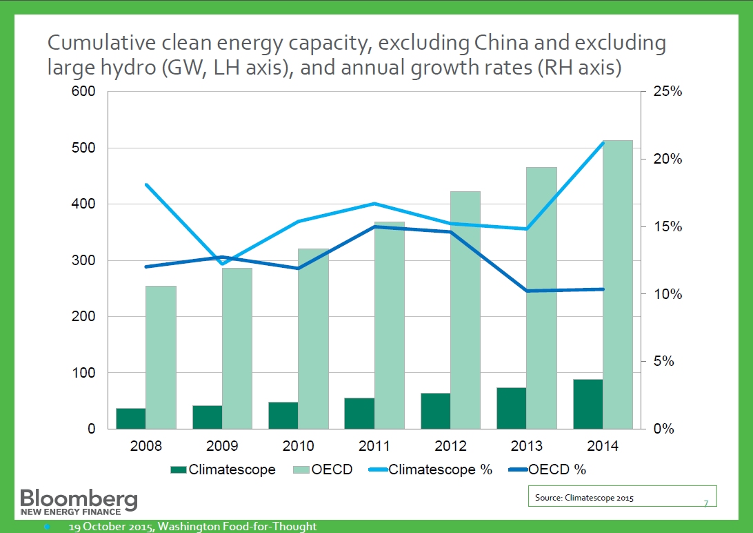 經(jīng)歷了法國史上最慘重的恐怖襲擊后,萬(wàn)眾矚目的巴黎氣候峰會(huì )也即將如期舉行,種種跡象表明,此次氣候大會(huì )或將取得重大突破。根據彭博新能源財經(jīng)(BNEF)11月23日發(fā)布的一份研究報告——Climatescope2015,新興市場(chǎng)正在成為全球應對氣候變化的有力推動(dòng)者。