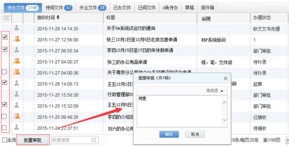 按照企業(yè)外出請假管理制度和程序,企業(yè)員工因公出差、因私請假、外出辦公,都需要填寫(xiě)申請單提交領(lǐng)導審批。OA系統實(shí)現了此類(lèi)管理從線(xiàn)下到線(xiàn)上的固化,但領(lǐng)導在審批時(shí),卻可能有多個(gè)審批單在領(lǐng)導待辦中等待審批,需要領(lǐng)導一個(gè)一個(gè)打開(kāi)進(jìn)行審批。在慧點(diǎn)科技OA系統中,領(lǐng)導可以在待辦事項列表中直接查看到員工的出差、請假、外出事由,直接勾選多條待審批事項,點(diǎn)擊“批量審批”,填寫(xiě)審批意見(jiàn)后,一鍵完成批復。