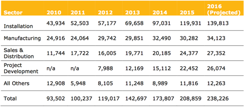 2010-2016年美國太陽(yáng)能行業(yè)就業(yè)的觀(guān)察和預期