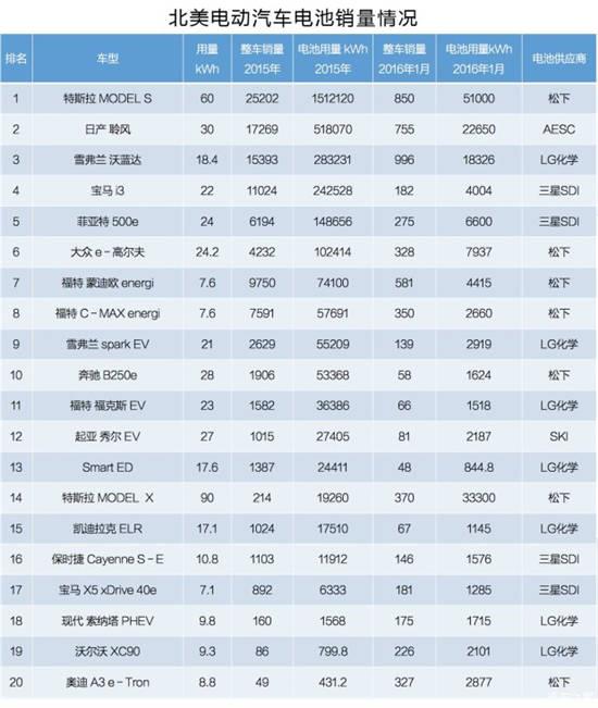從2015年美國市場(chǎng)電動(dòng)汽車(chē)電池供應商排名前五名,分別是日本松下、日本AESC、韓國三星SDI、韓國LG化學(xué)、韓國SKI,這五家電池再2015年的電池供應總量為3230兆瓦。其中松下的高出貨量得益于特斯拉的純電動(dòng)汽車(chē),其中MODELS的一年銷(xiāo)售25202輛,總的電池需求為1512120KWh。如果特斯拉MODEL3的上市,如果市場(chǎng)反應不錯的話(huà),松下也將受益匪淺。