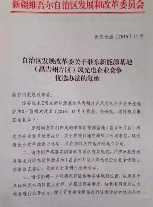 近日,記者獲悉,新疆發(fā)改委向昌吉州發(fā)改委印發(fā)《關(guān)于準東新能源基地(昌吉州片區)風(fēng)電、光伏企業(yè)競爭優(yōu)選辦法》的回復,原則上同意該地區開(kāi)展風(fēng)電、光伏發(fā)電企業(yè)通過(guò)競爭方式開(kāi)展新能源項目建設。