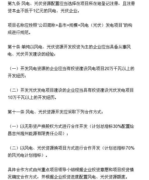 根據競爭辦法昌吉州將指標的30%配置地方國資企業(yè)“庭州能源”,其余的70%總指標將以風(fēng)電、光伏資源換項目投資的方式實(shí)施。該公司以無(wú)形資產(chǎn)換股權方式進(jìn)行合作開(kāi)發(fā),擁有資源開(kāi)發(fā)權的昌吉州庭州能源有限責任公司和資源所在地縣市的國資公司共同享有不低于風(fēng)電合作開(kāi)發(fā)公司15%的股權,享有不低于光伏發(fā)電合作開(kāi)發(fā)公司8%的股權。