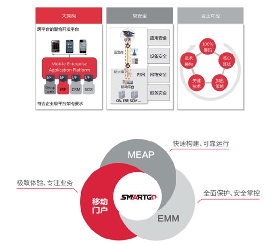從官方資料看,SmartGO包含三個(gè)部分:MEAP、EMM、移動(dòng)門(mén)戶(hù);SmartGO.MEAP提供了基于HARP混合開(kāi)發(fā)框架,解決的是我們常說(shuō)的跨平臺移動(dòng)應用開(kāi)發(fā)問(wèn)題。而對于企業(yè)常見(jiàn)的各業(yè)務(wù)系統集成問(wèn)題。SmartGO.MEAP提供了超過(guò)10種連接器,能便捷的與各類(lèi)后臺業(yè)務(wù)系統集成,并能夠在高并發(fā)、大數據量訪(fǎng)問(wèn)的同時(shí)保障穩定、可靠的運行。