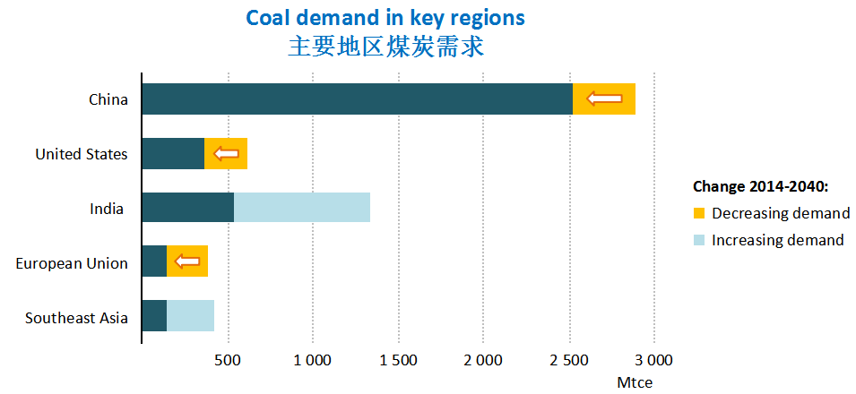 煤炭行業(yè)的未來(lái)處境可謂“雪上加霜”,主要地區煤炭需求不斷回落。IEA指出,中國的能源轉型是影響全球大勢的關(guān)鍵所在,煤炭消費達峰標志著(zhù)煤炭行業(yè)的轉折點(diǎn)。未來(lái)煤炭需求將大幅回落,IEA預計2040年中國煤炭需求僅為2500百萬(wàn)噸標準煤。為了控制空氣污染,減少碳排放,電力和天然氣將填補煤炭需求減少的空間,其中,天然氣的使用量將在21世紀30年代超過(guò)煤炭。