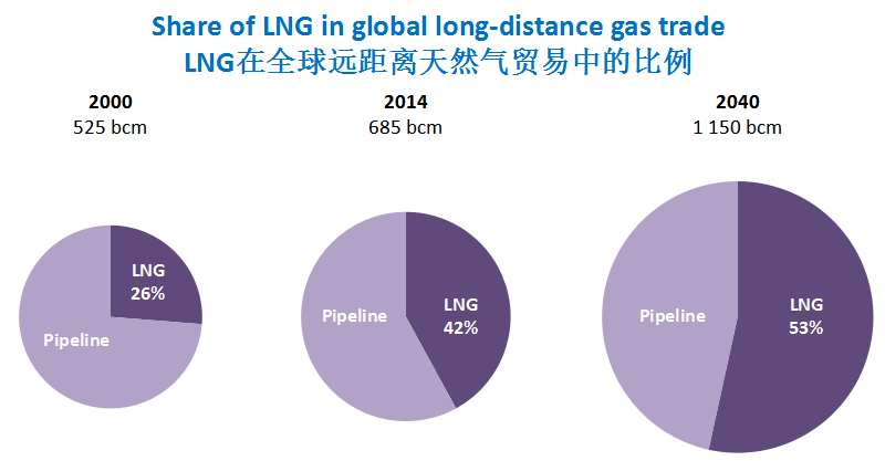 從天然氣領(lǐng)域來(lái)看,液化天然氣(LNG)推動(dòng)了又一次天然氣革命。Tim Gould介紹,當前,天然氣市場(chǎng)轉型不斷加深,LNG在全球遠距離天然氣貿易中的占比也不斷提高,到2040年這一比例將達到53%??紤]到當前LNG市場(chǎng)供應已經(jīng)充足,澳大利亞、美國及其他新LNG出口國的加入將給相關(guān)合同條款和價(jià)格機制帶來(lái)挑戰。