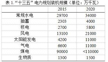 “十三五”期間,全國常規水電新增投產(chǎn)約4000 萬(wàn)千瓦,開(kāi)工6000 萬(wàn)千瓦以上,到2020 年,常規水電裝機達到3.4 億千瓦,抽水蓄能電站裝機新增約1700 萬(wàn)千瓦,達到4000 萬(wàn)千瓦左右;全國核電投產(chǎn)約3000 萬(wàn)千瓦,開(kāi)工3000 萬(wàn)千瓦以上,2020 年裝機達到5800 萬(wàn)千瓦。2020 年,風(fēng)電裝機達到2.1 億千瓦以上;太陽(yáng)能發(fā)電裝機達到1.1 億千瓦以上。“十三五”期間,氣電新增投產(chǎn)5000 萬(wàn)千瓦,2020 年達到1.1 億千瓦以上。“十三五”期間,取消和推遲煤電建設項目1.5 億千瓦以上;煤電裝機規模力爭控制在11 億千瓦以?xún)取?/p>