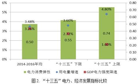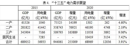 根據“十三五”規劃綱要的發(fā)展目標,“十三五”期間GDP年均增速要保持在6.5%以上,預計到2020年,我國GDP總量將達到94.4萬(wàn)億元。結合電力發(fā)展規劃目標,預計“十三五”我國電力消費彈性系數約為0.74。由表2中的數據可以看出,以電力消費彈性這一指標來(lái)看,從“十五”到“十三五”,該指標一直呈下降趨勢。然而,“十三五”期間電力彈性能否維持0.74的水平,這仍然是一個(gè)值得深思的問(wèn)題;也就是說(shuō)“十三五”期間,年均4.8%甚至更高的用電量增速是值得深究的。