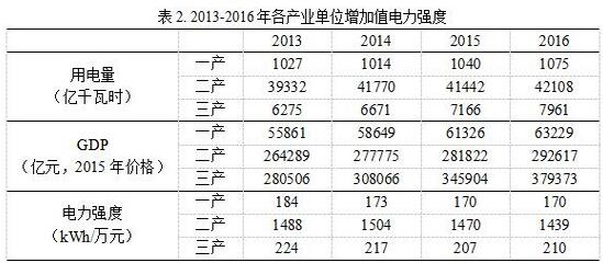 為更好地把握“十三五”期間電力需求態(tài)勢,本文對于近4年(2013-2016年)三次產(chǎn)業(yè)的增加值電力強度做進(jìn)一步分析??傮w來(lái)看,三大產(chǎn)業(yè)的電力強度均呈現下降的趨勢,盡管出現個(gè)別年份出現小幅反彈的情況,但是總體依舊處于下降通道。