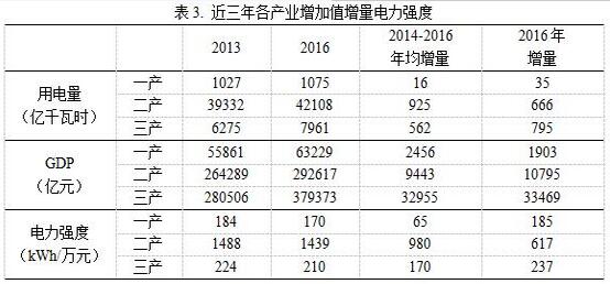 進(jìn)一步,對三次產(chǎn)業(yè)近三年的增加值增量與用電量增量的關(guān)系進(jìn)行分析。結果表明,平均來(lái)看,各產(chǎn)業(yè)近三年增加值增量部分的電力強度均比對應年份的總體水平低,“二產(chǎn)”尤為明顯,這也與各產(chǎn)業(yè)電力強度持續下降的趨勢吻合。