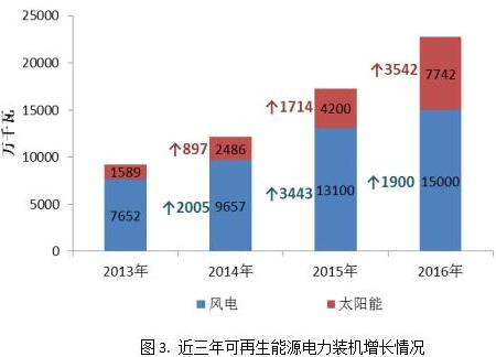 從近三年可再生能源電力裝機增長(cháng)情況來(lái)看,風(fēng)電和太陽(yáng)能裝機規模均快速增長(cháng),可再生裝機規模年均增長(cháng)約4500萬(wàn)千瓦。具體來(lái)看,截至2016年,我國風(fēng)電裝機規模1.5億千瓦,近三年年均增長(cháng)約2500萬(wàn)千瓦;太陽(yáng)能裝機規模7742萬(wàn)千瓦,近三年年均增長(cháng)約2000萬(wàn)千瓦。而根據“十三五”電力規劃的發(fā)展目標,2020年風(fēng)電裝機在2015年1.3億千瓦的基礎上新增約8000萬(wàn)千瓦,年均投產(chǎn)僅1600萬(wàn)千瓦,太陽(yáng)能裝機規模目標為1.1億千瓦,新增6800萬(wàn)千瓦,年均投產(chǎn)僅1360萬(wàn)千瓦。與近幾年的發(fā)展趨勢相比,按照規劃目標,可再生電力發(fā)展速度卻將明顯放緩。