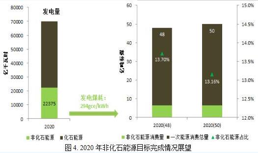 從非化石能源目標來(lái)看,根據“十三五”電力規劃,預計2020年我國非化石能源發(fā)電量為2.24萬(wàn)億千瓦時(shí)。按照310gce/kWh的供電煤耗目標(對應的發(fā)電煤耗水平約294gce/kWh)核算,非化石電力生產(chǎn)對應的一次能源供應量為約6.6億噸標煤。按照50億噸標準煤的一次能源消費預期目標來(lái)計算,電力非化石一次能源占比僅為13.2%,15%的非化石能源占比目標料難完成。我們考慮2020年50億噸標煤的一次能源消費量目標可能過(guò)于樂(lè )觀(guān);但即便是按照較為合理的48億噸標準煤來(lái)計算,電力非化石能源在一次能源中的占比也僅為13.7%,與15%的目標仍有較大差距。