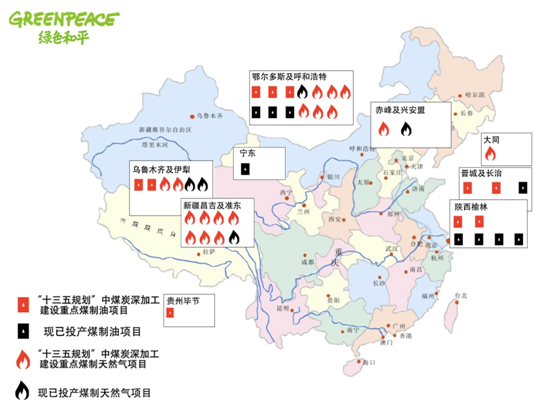 “規劃”列出了重點(diǎn)建設的煤化工項目及區域。根據綠色和平的統計,符合“規劃”中重點(diǎn)建設范圍和條件的煤制油、煤制氣項目產(chǎn)能總計約為2050萬(wàn)噸和737.25億立方米,也遠遠超出了“規劃”所限定的1300 萬(wàn)噸煤制油和170 億立方米煤制氣的總量。