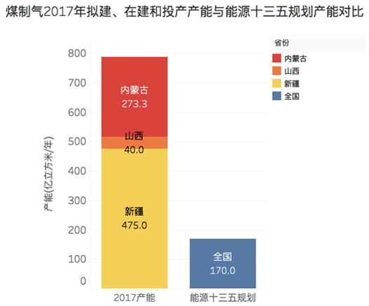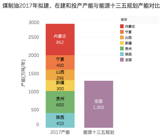 而根據綠色和平的統計,截至2017年1月,中國現投產(chǎn)的煤制油、煤制氣項目產(chǎn)能分別為818萬(wàn)噸和51.05億立方米,加上在建和已經(jīng)拿到路條隨時(shí)可能開(kāi)建的項目,符合“十三五”建設條件的地區煤制油、煤制氣產(chǎn)能總計達到了2868萬(wàn)噸和788.3億立方米,遠遠超出了“十三五”規劃產(chǎn)能。
