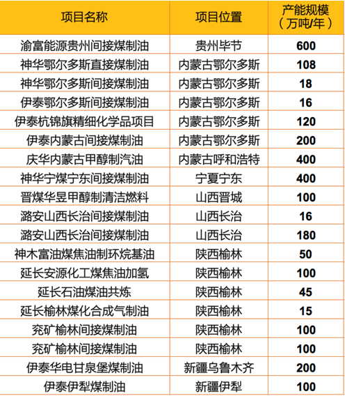 附:表1. 符合十三五規劃的煤制油項目及產(chǎn)能明細(包括已投產(chǎn)的項目)