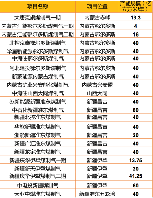 表2. 符合十三五規劃的煤制氣項目及產(chǎn)能明細(包括已投產(chǎn)的項目)