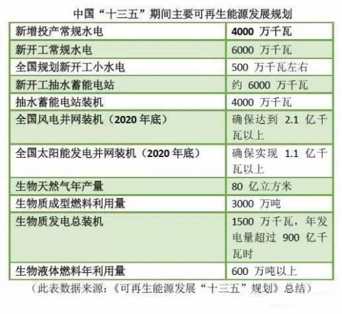 我國可再生能源發(fā)展的重要指南《可再生能源發(fā)展“十三五”規劃》中顯示,為實(shí)現2020、2030年非化石能源占一次能源消費比重分別達到15%、20%的能源發(fā)展戰略目標,到2020年,全部可再生能源年利用量7.3億噸標準煤;全部可再生能源發(fā)電裝機6.8億千瓦,發(fā)電量1.9萬(wàn)億千瓦時(shí),占全部發(fā)電量的27%;各類(lèi)可再生能源供熱和民用燃料總計約替代化石能源1.5億噸標準煤。
