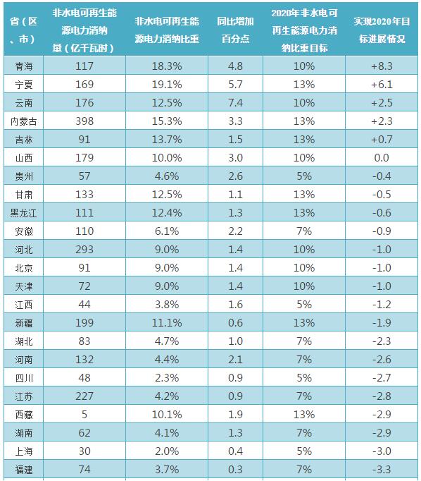 青海、寧夏、云南、內蒙古、吉林和山西非水電可再生能源消納比重已達到2020年目標,貴州、甘肅、黑龍江、安徽、京津冀和江西接近實(shí)現目標,陜西、海南、廣東、遼寧和山東實(shí)現2020年目標還有較大差距。